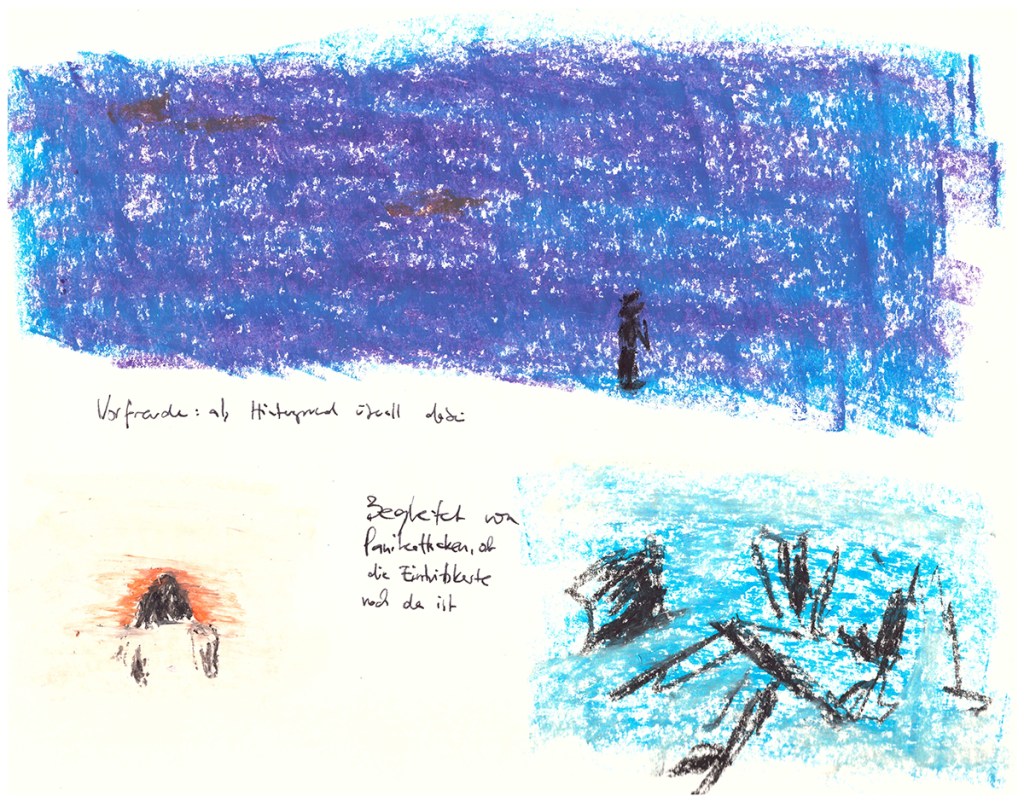 Für eine so umfangreiche Arbeit ist es mir besonders wichtig ein Thema zu finden, das aus mir spricht. Während der Lockdowns 2020/21 fehlten mir Konzerte. Die digitalen Übertragungen machten eine Lücke im Fühlen von Atmosphäre deutlich. Also entwickle ich Skizzen, was einen Konzertabend für mich ausmacht, welche Handlungen und Abläufe dazu gehören.