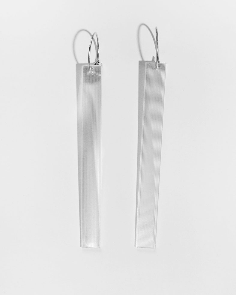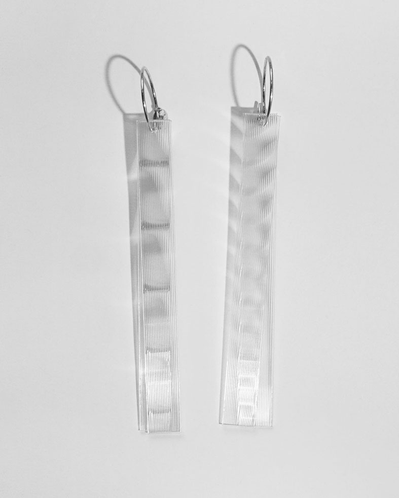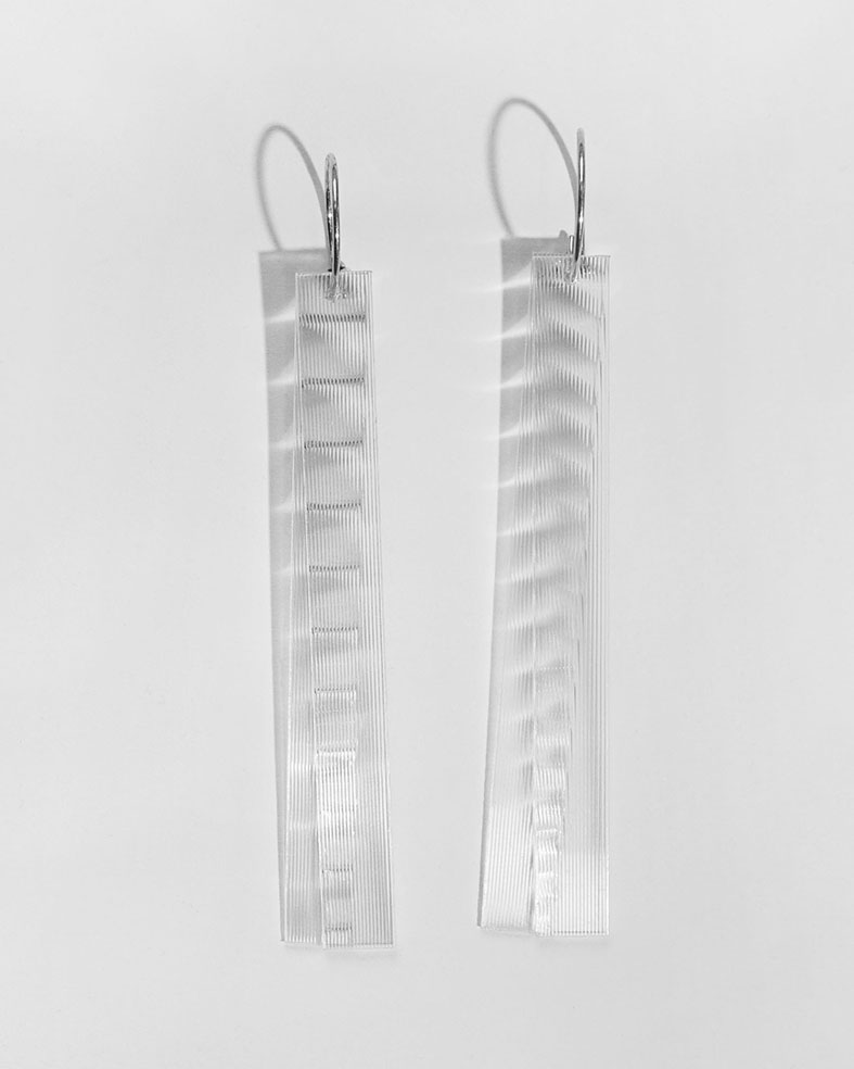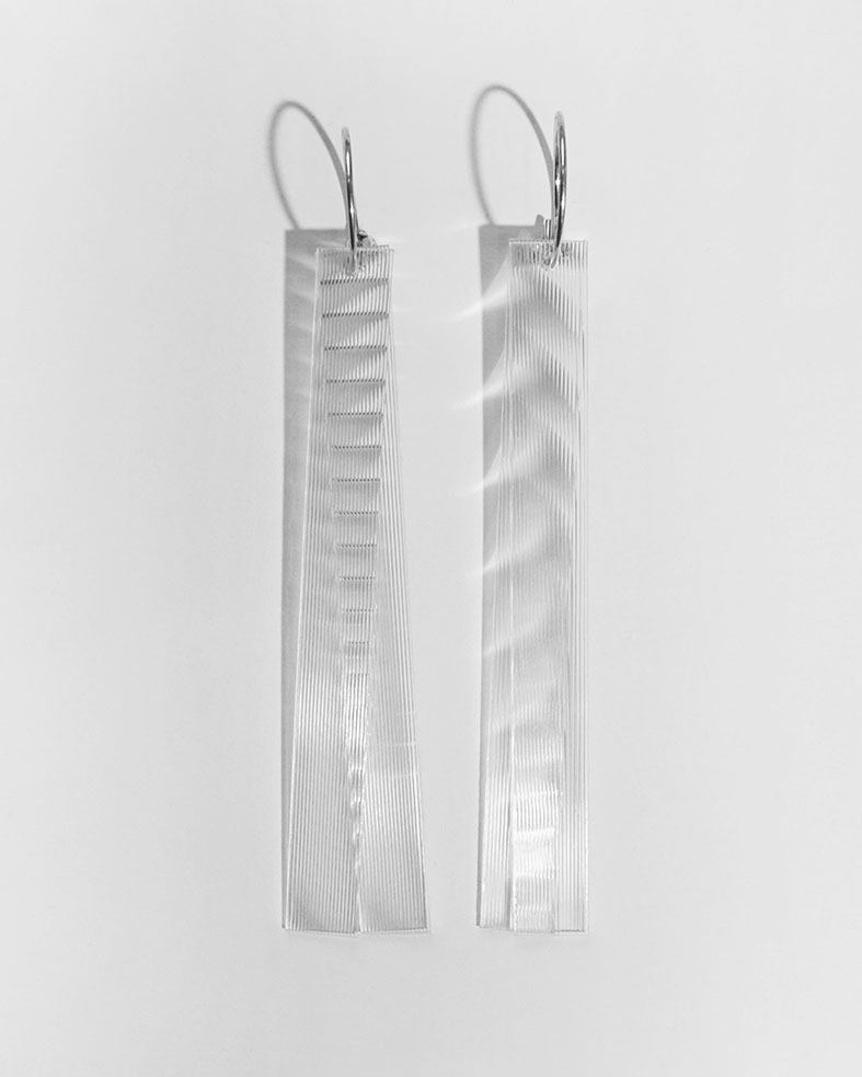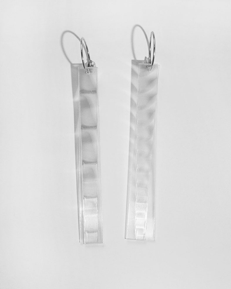 In der Studie zu diesen Ohrhängern, suchte ich ein Funkeln und Glitzern, ohne Edelsteine. Mit diesem geschliffenen Kunststoff, der auch für 3D-Wackelpostkarten genutzt wird, kann ich das Schillern aus Süddeutschland mit transparenten Handelswegen beziehen und kombiniere es mit handgefertigten Creolen aus recycelten Silber.
